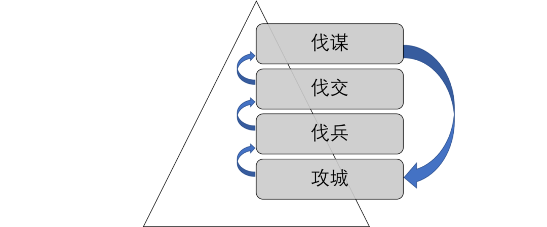 一个基本的市场策略,从进入一个新市场的“攻城”策略开始;等积累到一定的规模,就要进入全面竞争的“伐兵”策略。公司发展得足够大时,一定要从全面竞争进阶到生态竞争的高度,这个时候就用“伐交”的策略。公司不能总是停留在红海一个市场,一定要不断地审视自己的市场选择,这就逼着CMO要进入到“伐谋”阶段,辅助或者主导公司业务战略的开发。等选择好了新的市场,可能又会从“攻城”的谋略阶段开始,敏捷地转换新的玩法,在新的市场迅速地攻城略地。