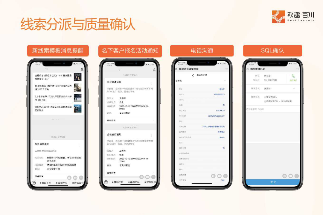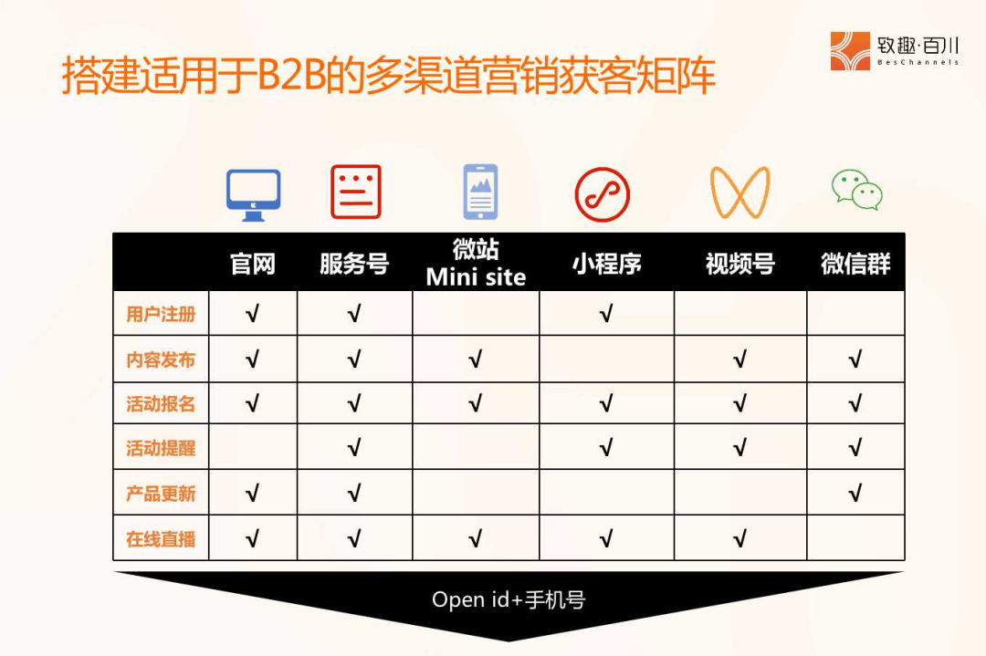 这4个变量的前2个变量,是市场人的使命,而后面两个更多是落到销售身上的,所以销售要想办法把后面两个指标精益求精。市场人需要更关心前面的指标,除了Raw leads,Qualified leads也需要成为未来几年To B市场人努力的方向。这会让我们离客户近、离生意近,我们自己的能力也会得到很大的提升。致趣百川的“鱼池养鱼方法论”,大家都很熟悉了。上半年我们已经对这个方法论进行了迭代。我们需要更关心怎么在内部的角度上思考如何将这个方法论落地,这就涉及到了变革管理——怎么把信息同步给其它的部门,团队协作怎么办,KPI协作流程怎么制定。这也是秩序,也是致趣百川一直在做的事情。我们为To B的市场部提供一站式的营销云。从早期我们做CRM,到把活动在线化,再把内容在线化,再到营销自动化,以及未来的半年到一年,我们会致力于针对To B的CDP,开发以客户为中心的数据平台产品。因为时间关系,前面我们把最重要的事情讲得差不多了,后面会跟大家把这三个事情再延展一下——获客、孵化、营销闭环。从“获客”角度看,越大的公司会越容易。但初创公司可能会比较难,但这个方法论依然适用。获客主要关心Raw Leads,这跟我们传统模式中在线下拿到的静态客户名单是完全不一样的。我们市场人关心的是,在数字化时代,当客户找到我们的时候愿意主动留下联系方式,而且要非常合规。“自愿”这一点很重要,因为可预见的未来10年,不管是国家还是个人,数据隐私的保护会变得越来越严格。再看我们获客的矩阵,包括官网、服务号、微站、小程序等,现在我们发现视频号越来越强,而通过微信群、企业微信,未来用户可以更加舒服地跟企业沟通。而我们致趣百川要做的,就把通过工具将这些平台更好地管理起来,尤其是背后的数据、潜在客户等。每个阵地的触点不一样,要负责的场景也会不一样。所以,To B跟To C不一样的地方,就在于To C的购买流程太短了,导致在任何触点或者场景都可以快速完成交易,但To B不一样。有时候我们经常会问自己,这个客户是通过官网来的,但他真的是从官网上来的吗?未必。客户可能更早的时候就在微信上看到过内容,也可能听到某个老客户或者朋友的推荐等,到官网是比较后面的动作而已。这就是To B和To C不一样的地方,To B要考虑购买流程的复杂性和渠道的多样性。第一,全员营销。需要在组织内部推动,市场人辛辛苦苦做内容,怎么协同其它部门的同事把好内容分享出去。致趣百川在技术上做了这件事情很多年,因为微信提供这样的能力,所以能够比较好的监测和溯源。以致趣百川的客户金蝶为例,他们在疫情过后很快就做出了响应,从董事长开始推进全面数字化,办了很多线上活动,像“走进格力”这场线上会议有将近2万多的新增注册。所以,公司越大,内部形成协同、获客会越容易,因为本身要做的第一件事情,是市场、销售协同的社交营销,这是将已有资源利用起来。然后再看“怎么花钱用外部的资源”,所以这个事情的本质是内部协同。