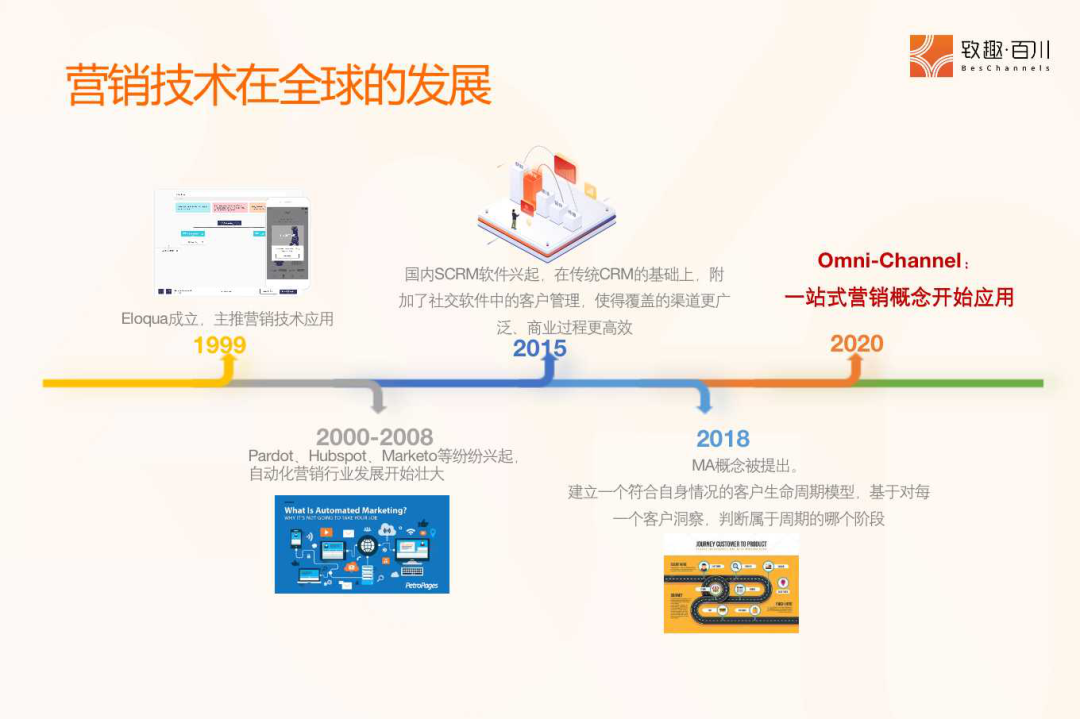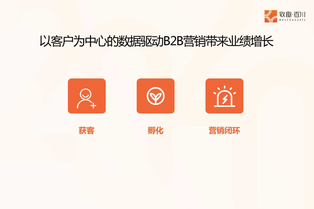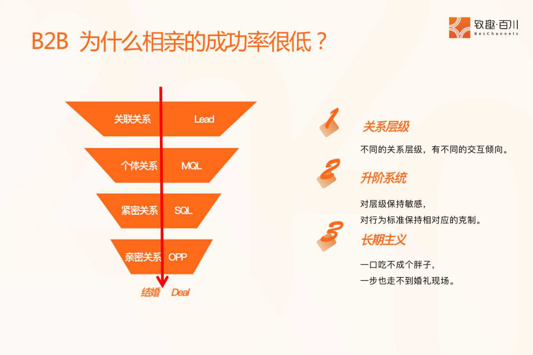 《2020To B CGO新生代增长实战大会》圣诞特别版的我叫何润,非常开心能够跟各位新老朋友在这里聊一聊我们在做的事,致趣百川是一家提供一站式营销云软件解决方案的企业,帮助科技、医疗、工业制造业等B2B企业搭建营销技术基础设施,加速数字化转型。成立以来,致趣百川也做了很多内容,这也使得致趣成为了一家更理解我们To B市场人的公司。今天的分享跟一站式营销云有关。我们回顾一下整个营销技术的发展,国外从1999年开始,就出现了营销技术公司,像Eloqua和Salesforce都在那时成立,开始做营销业务。 后来,金融危机前后,国外好多家公司开始进入这个领域,而金融危机也推进了营销云的使用,跟今年疫情推进了营销技术的使用有很多相似的地方。在国内,我们几年前就开始做CRM,到2016年我们开始正式做国内的To B营销业务。直到今天,在我们看来,我们的定位以及目标就是要朝着为To B市场人提供一站式营销工具的方向走 。这是一张MarTech 8000的图,密密麻麻,已经复杂到连每个岛上面的字都看不清了。简单来看,我们会把To B的生意用这几朵云来概括——包括上游的 AdTech、中游的MarTech, 以及下游的SalesTech。工具只是一方面,更重要的还是要了解To B公司面向的客户是谁?他们是怎么进行购买的?他们为什么要买我们?致趣百川作为To B的MarTech企业,我们一定要离一线更近一点,要离销售近、离客户近,看看他们眼中我们是怎样的。所以在我看来,更多的重心还要放在我们的客户身上,因为没有人会凭空从陌生人变成我们的客户。为了帮助大家理解这个事情,我们把To B的成交过程和恋爱结婚做一下类比。两个人的发展,从一开始的建立关系,到恋爱,再到更紧密的关系,最后才到结婚。不会一步就走到婚礼现场。To B也是如此,从陌生人变成客户需要走过比较长的历程。这是To B跟To C不一样的地方。虽然To B在售前阶段需要付出更多的努力,但在售后阶段也会产生更多的效果,客户到了后端阶段不是那么容易流失的。所以不要担心前面花的功夫过长。前几年我自己出的一本书叫《获客》,现在再看这本书,我觉得获客只是MarTech要关心的诸多事情中的一部分而已。未来的几年,除了获客,致趣百川还会帮助更多的市场人,甚至可能也会帮助一些To B企业的销售向漏斗的下一个阶段“转化”进行推进。这件事大概一年前我们就在做了。随着时机越来越成熟,大家对它的理解越来越深刻,我们发现,它在未来会变成更加重要的工作。所以这里用到一张图。如果市场人辛辛苦苦带来的很多线索直接交给销售,中间会缺少很多培育的环节。培育就像是在谈恋爱,从建立关系开始,然后到约会,你需要创造很多机会,让两人之间的关系变得越来越近。但是如果没有这个过程,就会出现市场人认为销售跟进不及时等情况,但其实销售的带宽是有限的,一个销售同时能跟进30~50个商机就很不错了,所以我们不能指望所有的线索都直接给到销售。那么这些潜在客户在这个阶段还没有到需求产生,该怎么处理?如果销售同学自己没有足够的精力跟进这些线索,就需要其他的部门跟客户持续的互动。一些客户可能之前没有预算,但未来可能会有预算,这些都是动态的。所以不能等到客户哪天有需求的时候,你突然出现,说:”我们要恋爱,我们要结婚“,这个是不合逻辑的。市场人除了感性也要很理性,而理性的事情这张图就可以总结得非常透彻。这张图来自我们一直以来特别关注的一位KOL叫Aaron Roes,他是Salesforce从1亿美金做到10亿美金的阶段中商机部门的负责人,写了一本书叫《Predictable Revenue(可预测的销售收入增长)》 ,在亚马逊上卖的特别好,我们每年都会把这本书重新看一遍。简单总结下来,实现可预测的收入增长主要就是4个步骤,而这4个步骤如果先后顺序发生改变的话,就会出现很大的错误。要先在小池塘里面学会做一条大鱼。对于大公司来说不用担心这一点,这对初创公司很重要。早些年,大家可能认为什么事情都能干,但这是错误的。因为To B生意的天花板和障碍不仅仅在前端。是否能够增长更多取决于是否能够规模化的交付服务,直到最后产生续约,再到进行扩张,这些是制约这个事情的门槛。